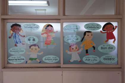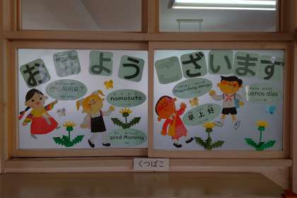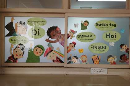 いろんな国にルーツをもつ子どもがいるので、いろんな国のあいさつが掲示されています。