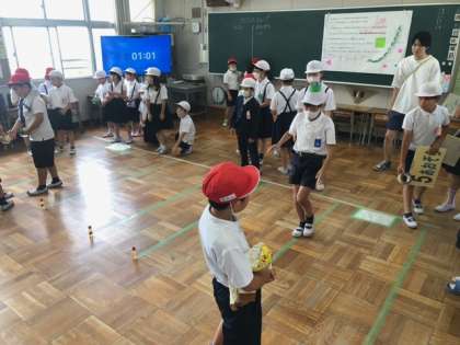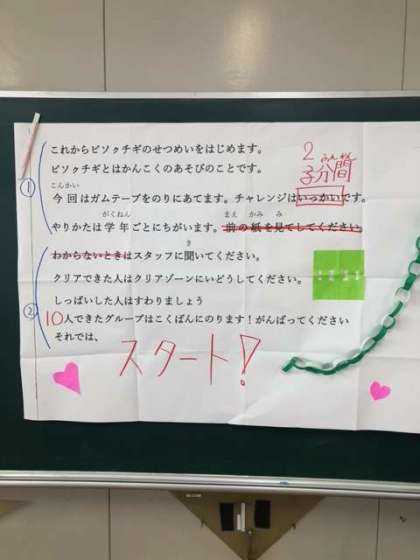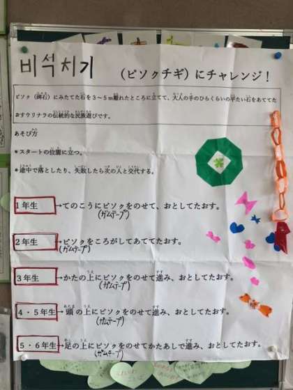 2年4組はピソッチギという韓国朝鮮の伝統的な遊びです。ガムテープを頭や足などに乗せて移動し、ガムテープを落として立ててあるスティックのりを倒します。みんなお店に来てくれてコマスムニダ。