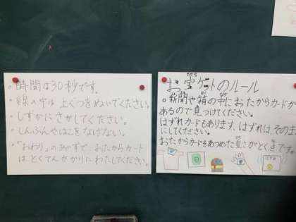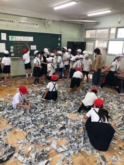 3年1組はお宝ゲットです。新聞紙の山からお宝を探します。一攫千金も夢じゃない。