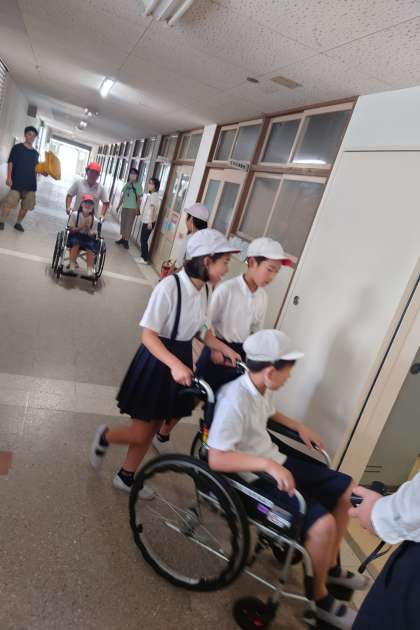 今度は、友だちに押してもらいながら、校舎や中庭を車いすで移動しました。