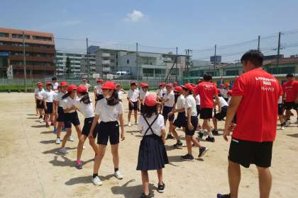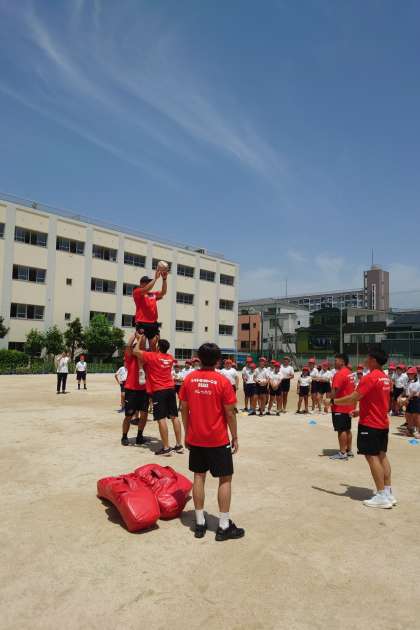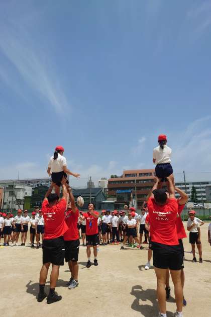 パス、キャッチ、タックルなど、ラグビーならではの動きを教えてもらい、楽しみました。
