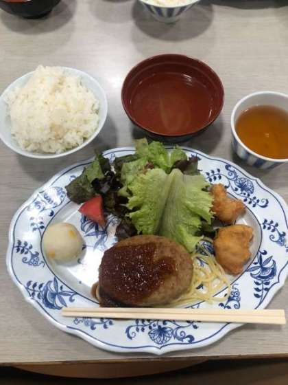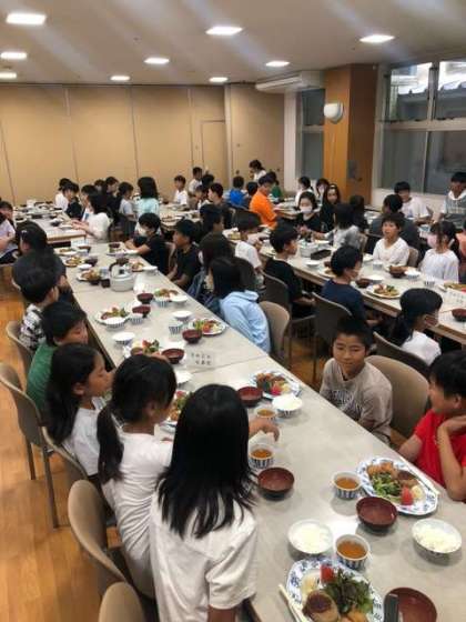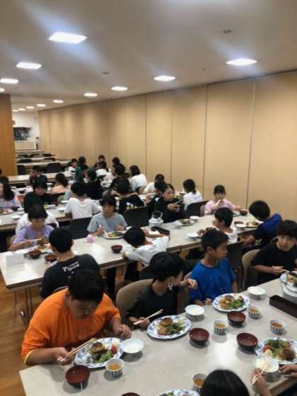 夕食の時間になりました。みんなお腹がすいていたみたいで、美味しそうに食べています。今日のメインはハンバーグと唐揚げです。
