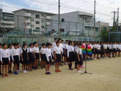まず、6年生の代表の人が、夏休みの平和登校日にみんなで折った折り鶴を紹介して、みんなの代わりに運んでくれることを伝えてくれました。