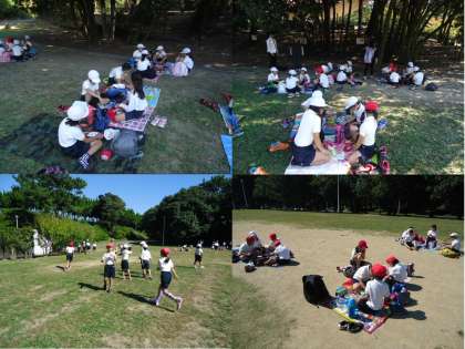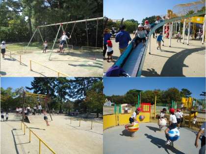 お弁当を食べた後は、「こどものらくえん」という遊具のある場所で思い思いに遊びました。他の学校だけでなく、幼稚園などの小さい子どももたくさんいましたが、順番を守ったり、譲ったりしながら上手に遊ぶことができました。