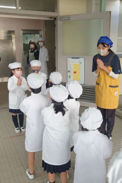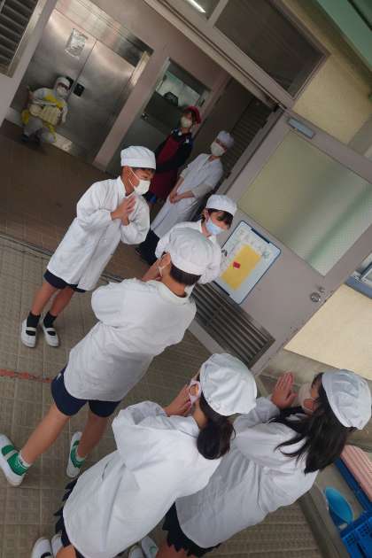 職場体験の中学生に2日間、給食室前に立って、給食当番の迎え入れをしてもらいました。