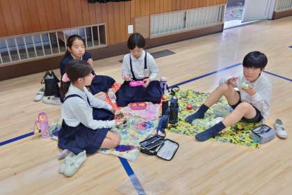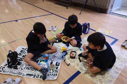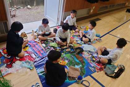 あいにくのお天気で、遠足は延期になりましたが、講堂で敷物を敷いて、みんなで楽しくお弁当を食べました。