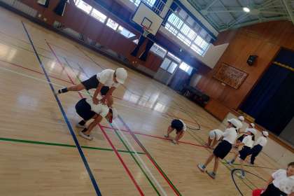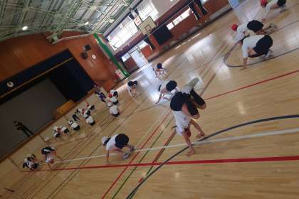 跳び箱がしっかり跳べるように、ウォーミングアップの運動を念入りにしています。