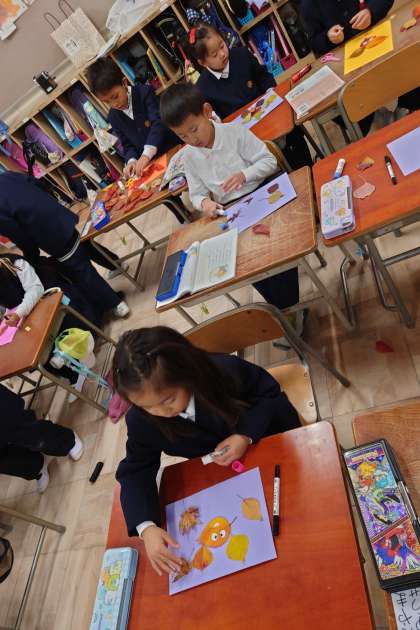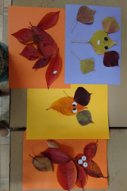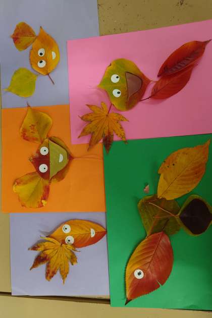 気に入った落ち葉を拾ってきて、今日はしおり作りをしました。