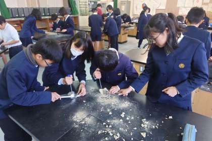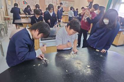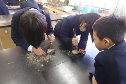 すごい音が聞こえてくるので、理科室を覗いてみると、化石探しの真っ最中でした。