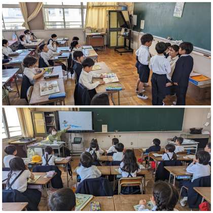 4組は、授業前に、配付物を配っていました。手紙をていねいに折って連絡袋に入れることも、1年生のときと比べててきぱきできるようになりました。
