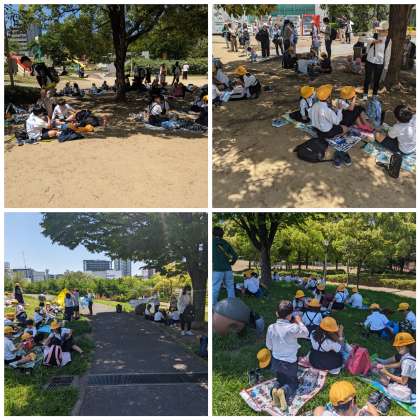 扇町公園でお弁当をいただきました。クラス毎に「いただきます」