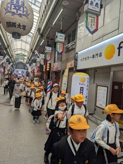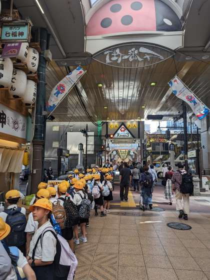 大阪で一番長い商店街である「天神橋筋商店街」を歩きました。1丁目から6丁目まで、約2.6kmああるそうです。「わたしたちの大阪」の教科書に載っている写真の場所を見ることができました。