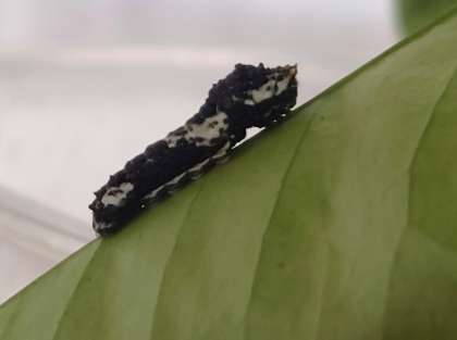 3年の廊下に連れてきたアオムシたちは、毎日ミカンの葉をモリモリ食べています。