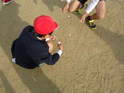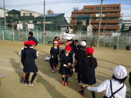 集会委員会の人が運動場にばらまいたたくさんの牛乳キャップのふたを拾い集めます。