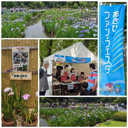 城北菖蒲園には色とりどりの菖蒲の花が咲いています。高殿小学校の中庭で育てた鉢も飾ってありました。