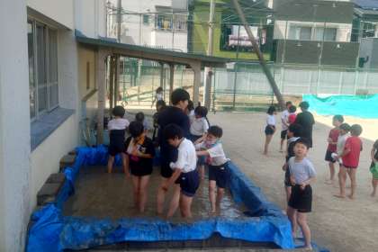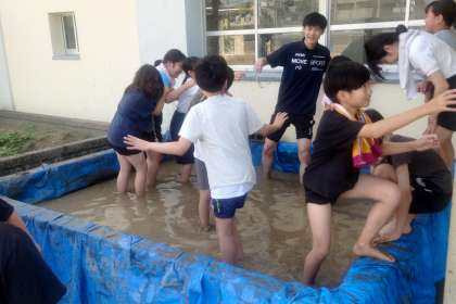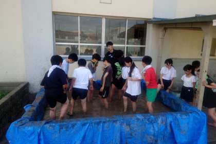 みんなが田んぼに入って、足でふみふみ。