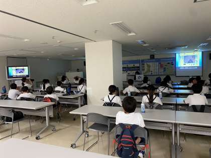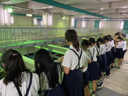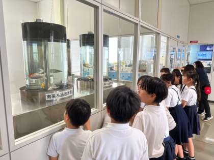 4年生は社会見学で庭窪浄水場へやってきました。普段私たちが使っている水はどのようにしてやってきているのかを学びました。淀川の汚れた水がきれいになっていく様子を見て、子どもたちは驚いていました。