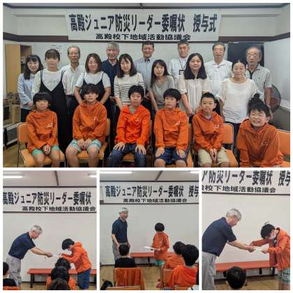 高殿高下地域活動協議会が主催の「高殿ジュニア防災リーダー委嘱状授与式」に、6名の児童と保護者の皆様が参加しました。6名とも防災についての意識が高く、ジュニア防災リーダーになってみよう!と応募しました。この意欲が立派ですね。