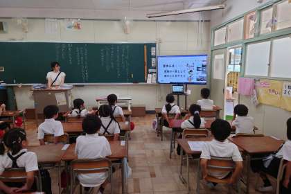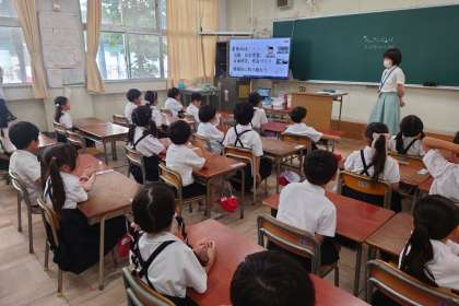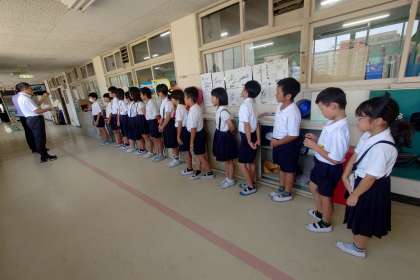 夏休みの過ごし方を確認し、大きな声で校歌を歌いました。