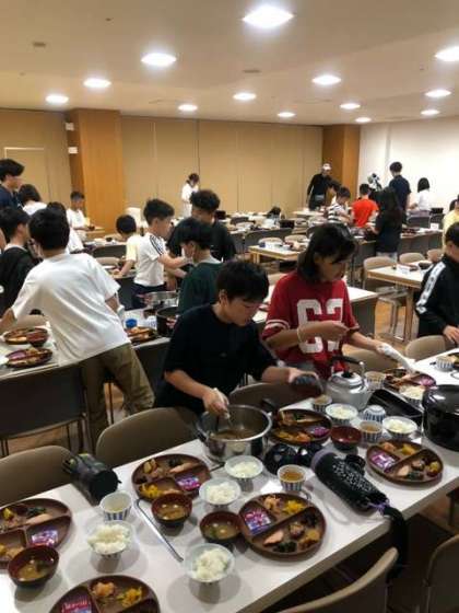 食事係がこれから始まる朝食の準備をしています。