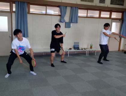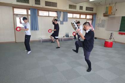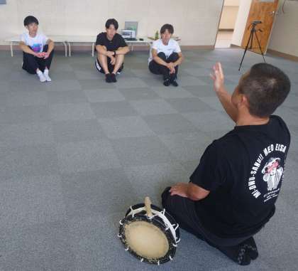エイサーとはどんなものかを教えてもらいました。むずかしいです!