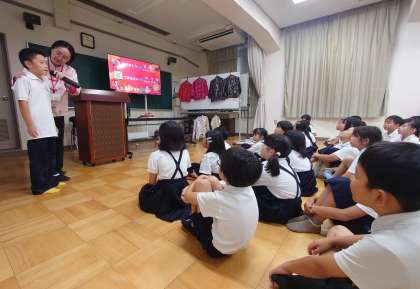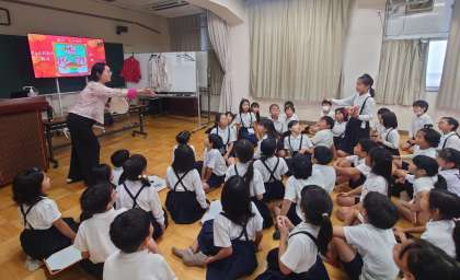 中国のあいさつは、2学期に中国から来た友だちがお手本になって、みんなで言ってみました。