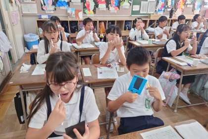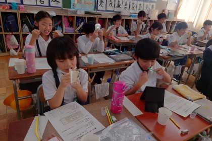 歯科衛生士さんに来ていただき、フッ化物洗口をしました。