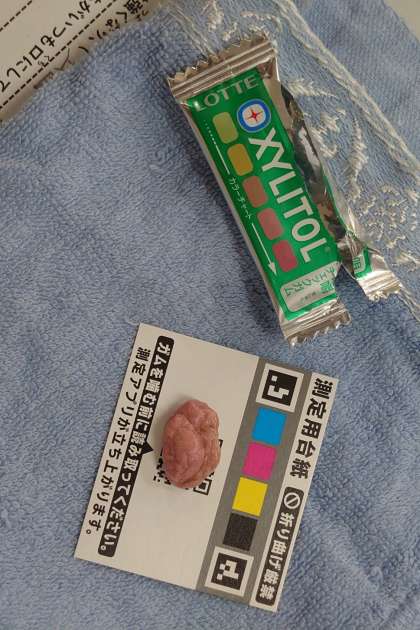 キシリトールガムを噛んで咀嚼力チェックをしました。アプリに判定してもらい、ガムの色の変化で咀嚼力が何点か分かりました。
