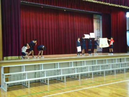 今日は月曜日ですが、全校朝会ではなく、児童集会として保健員会の発表を行いました。