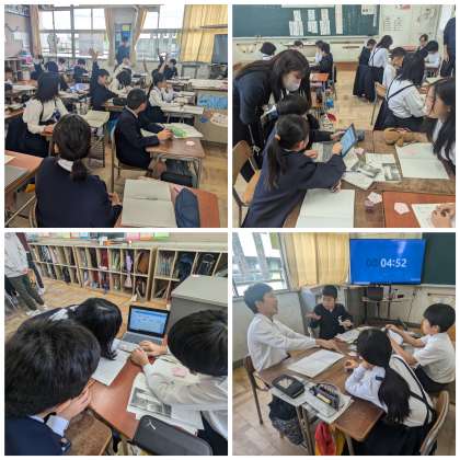 2時間目が1組、3時間目が3組で、プレ授業を行いました。受けつぐとは、何をどうすることなのかを読み取った後は、グループの意見をスカイメニューに載せて交流しました。