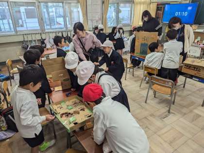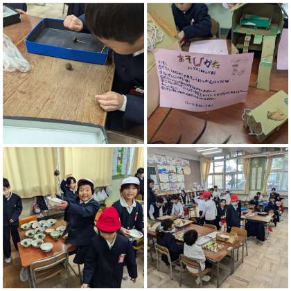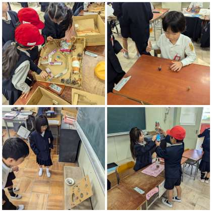 1年生は、先日の秋みつけで集めたどんぐりや落ち葉を使ったおもちゃを作りました。今日は「おもちゃランド」として、お店やさんを開きました。学年の半分の子がお店を開き、半分の子がお客さんになり、みんなが作ったおもちゃで遊びます。