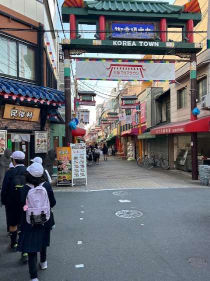 社会見学でコリアタウンに行きました。御幸通商店街では、グループでフィールドワークを行い、お店の方とお話をしながら買い物をしたり、タブレットで写真を撮ったりして、韓国・朝鮮の文化を見つけることができました。社会見学で学んだことをきっかけに、これから韓国・朝鮮と日本との関わりや文化について学びを進めていきます。