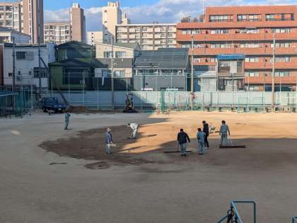 校園営繕園芸事務所にご協力いただき、本校の管理作業員と合同で、運動場フェンスの塗装と運動場の整地をしています。運動場に土を入れ平らにすることは、児童のけがの防止につながります。ありがとうございます!