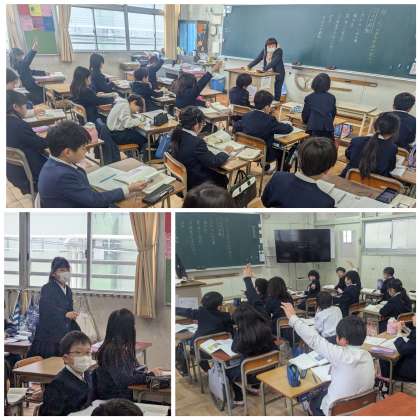 写真は、3年2組の国語の時間。全員が朗らかで、たくさん手があがっていました。発言が間違っててもへっちゃら♪友だちの発言、意見から、しかけのある物語について読み深めていました。