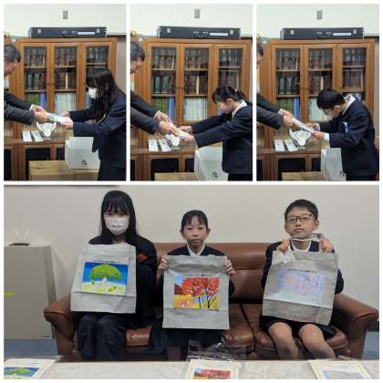 夏休みの課題の図画作品が賞に選ばれ、副賞として、エコバッグが届きました。昨日に間に合わなかったので、担任の先生と一緒に校長室で表彰しました。