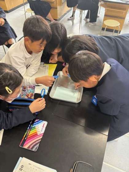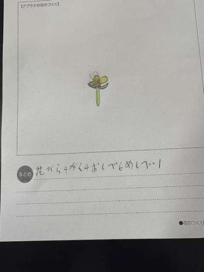 5年生ではさっそく理科の授業で、アブラナの観察をしていました。虫眼鏡を使い、花びらやがくなどを観察カードに記入していました。子どもたちはみんな興味津々でした。