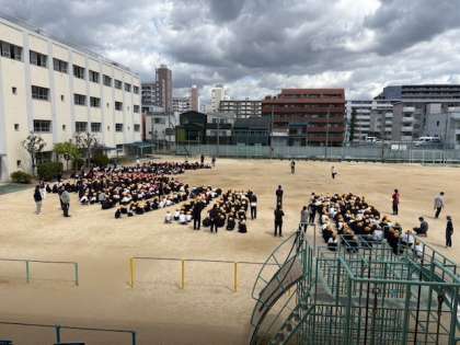 避難を開始してから、運動場に出るまでは、3分30秒でした。