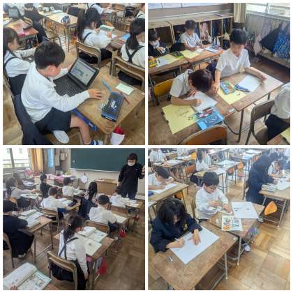 4組は、自分の生活の一場面を絵で表しました。クレパスで上手に描いていました。