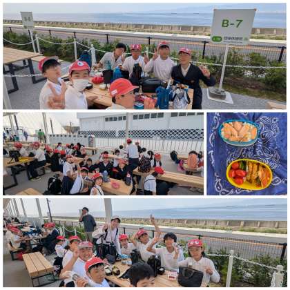 3,4組は一足早くお弁当タイム♪海沿いの団体休憩場です。さわやかな風が大変気持ちよく、みんな元気いっぱいです。