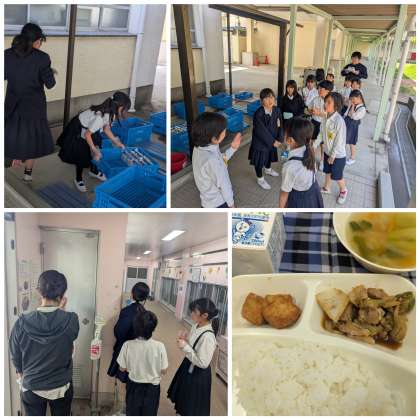 写真は給食委員会。返却しに来た2年1組がごちそうさまをする前に、片付けやすように整えていました。