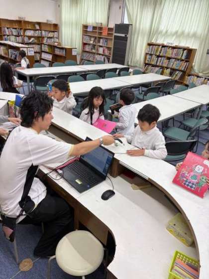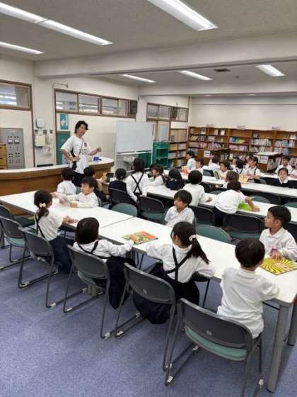 1年生の図書の時間。担任の先生の指示に従い、みんな図書室での過ごし方が素晴らしかったです。決められた席に静かに座り、自分の読書の時間をしっかり楽しんでいました。本の貸し出しの際も並んで貸し借りができています。高殿小学校にはたくさんの本が並んでいるので、いっぱい読んで、本好きになってくれるといいですね。