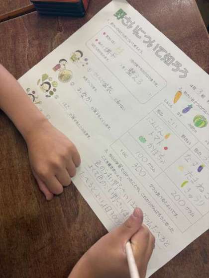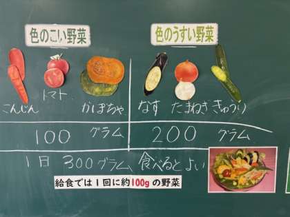 野菜はお好きですか?野菜を毎日食べていますか?毎日給食でも美味しくいただいている野菜について学習しました。なんと、野菜は毎日300グラムも摂ることが理想とされているようです。季節によっても旬の野菜は変わりますね。美味しくありがたく、身体によい野菜を摂取できるとよいですね。