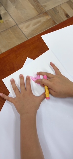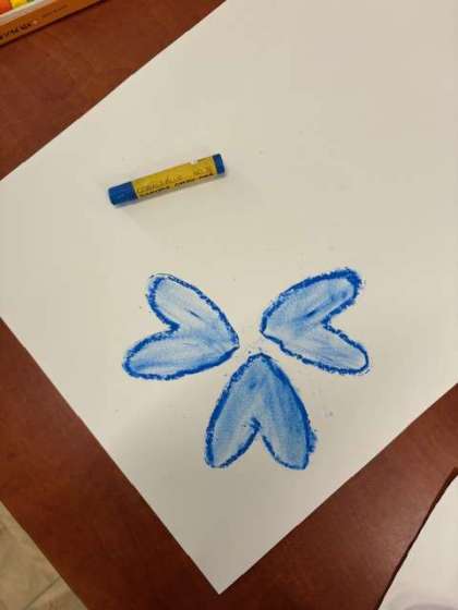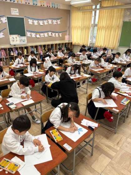 1年生の図工では、みんな思い思いのハートをクレパスで描き、指でこすってきれいな色を施す作品づくりをしていました。青色やピンクや赤など個性溢れた作品ばかりでした。