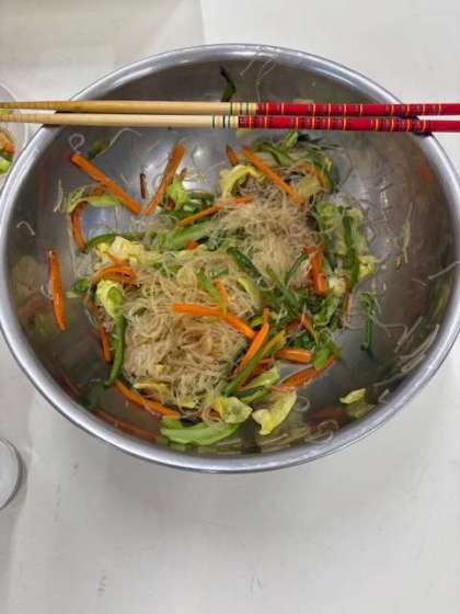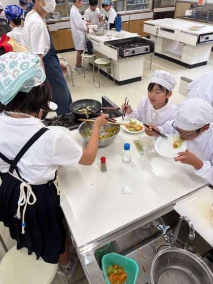 6年生は今年度初めての調理実習を行っていました。今日の調理は「チャプチェ」でした。班によって味付けの濃さや、野菜の切り方に違いがありましたが、どの班も美味しそうでした。後片付けもきれいに行っていました。