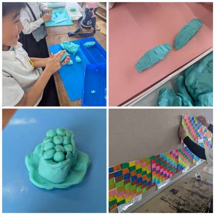 「色のもよう」クレパスで塗り込んだ紙をバランスよく並べます。それを教室に掲示していくと、まるでステンドグラスのように、教室が明るくなりました。写真は1組。完成した子からねん土をしましたが、「いらっしゃいませー!」とおすしを作っていました。いくらやまぐろ、おいしそうです♪