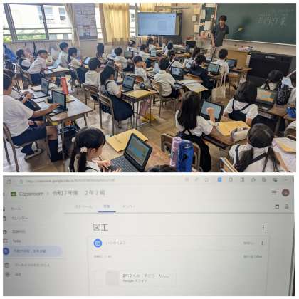 2組は、自分の作品を写真に撮り、パソコンに取り込んでいました。すると、全員の作品が画面で見ることができます。タブレットを活用した作品の鑑賞の仕方にチャレンジしていました。子どもたちも、すいすいと操作していて、友だち同士で教え合うこともできていました!