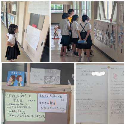 「友だちを大切にするとは何を大切にすることのなのか、校長先生に教えてね」と、感じたことを子どもたちはワークシートに書きました。2〜6年生の一部ですが、校長室前に掲示しました。すると早速、たくさんの子たちが、友だちの考えを読んでくれていました。