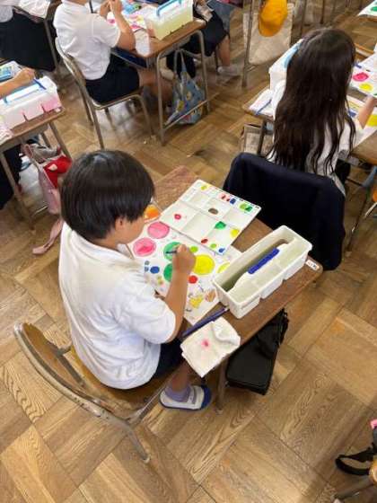 2年生の図工では、絵の具を使って円の中を塗る授業が行われていました。絵の具の学習では、筆洗や筆の置き場所、パレットの使い方、絵の具を出す所、絵の具の溶き方、などたくさんのことを学習します。子どもたちはみんな絵の具の使い方をマスターし、上手な筆使いで色を塗ることができていました。