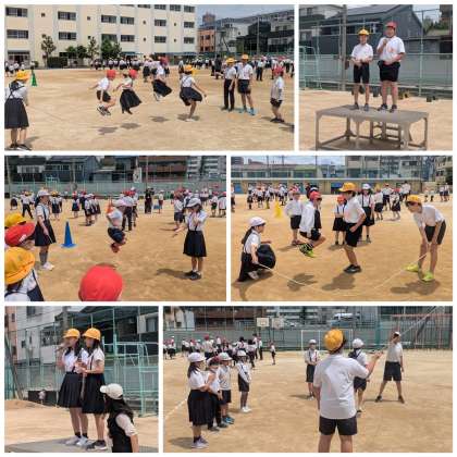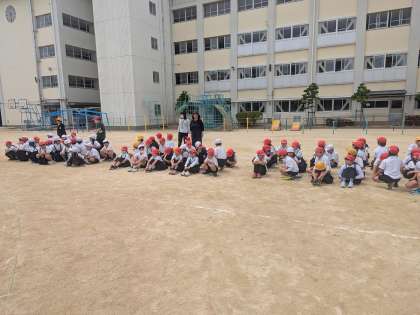 15分休みの運動場。3年生が各クラス、班ごとに並んでいます。