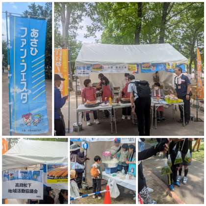 城北公園であさひファンフェスタが開催されています。高殿校下地域活動協議会はフランクフルト屋さんを出店しています。ぜひお越しください!